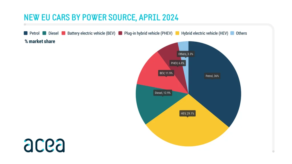 W kwietniu samochody elektryczne (BEV) utrzymały prawie 12% (11,9 %) rynku samochodowego w UE, podczas gdy udział samochodów hybrydowych (HEV) wzrósł z 24,9% do 29,1%. Natomiast łączny udział pojazdów benzynowych i tych z silnikiem wysokoprężnym spadł do niecałej połowy rynku, do 48,9%, w porównaniu z 52,8% w kwietniu 2023 r.