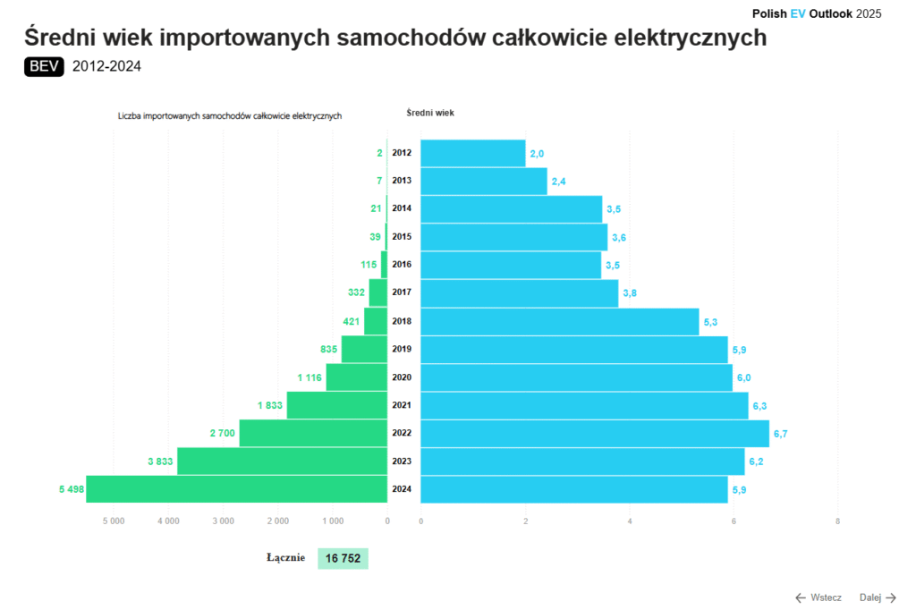 Średni wiek używanych BEV (dane Polish EV Outlook 2025) sprowadzanych do Polski w 2024 roku, to zaledwie ok. 6 lat (wykres powyżej), podczas gdy przeciętny importowany samochód spalinowy ma około 13 lat – to klarowny dowód, że importerzy i nabywcy BEV stawiają na nowsze pojazdy o mniejszym stopniu zużycia technologii bateryjnej.