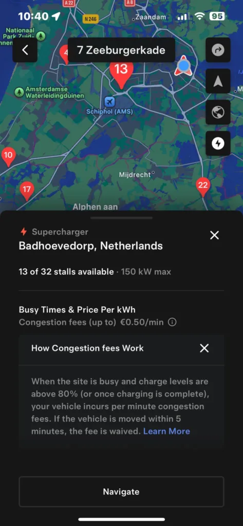Czy opłaty za bezczynność i za kolejkę mogą się łączyć? Nie – jak podaje Tesla, „jeśli na lokalizacji obowiązują opłaty za kolejkę, opłaty za bezczynność nie mają zastosowania i odwrotnie. Informacje o opłatach za bezczynność lub opłatach za kolejkę dla każdej stacji Supercharger są wyświetlane w wyskakującym okienku wybranej pinezki na ekranie dotykowym, a także w aplikacji Tesla”.