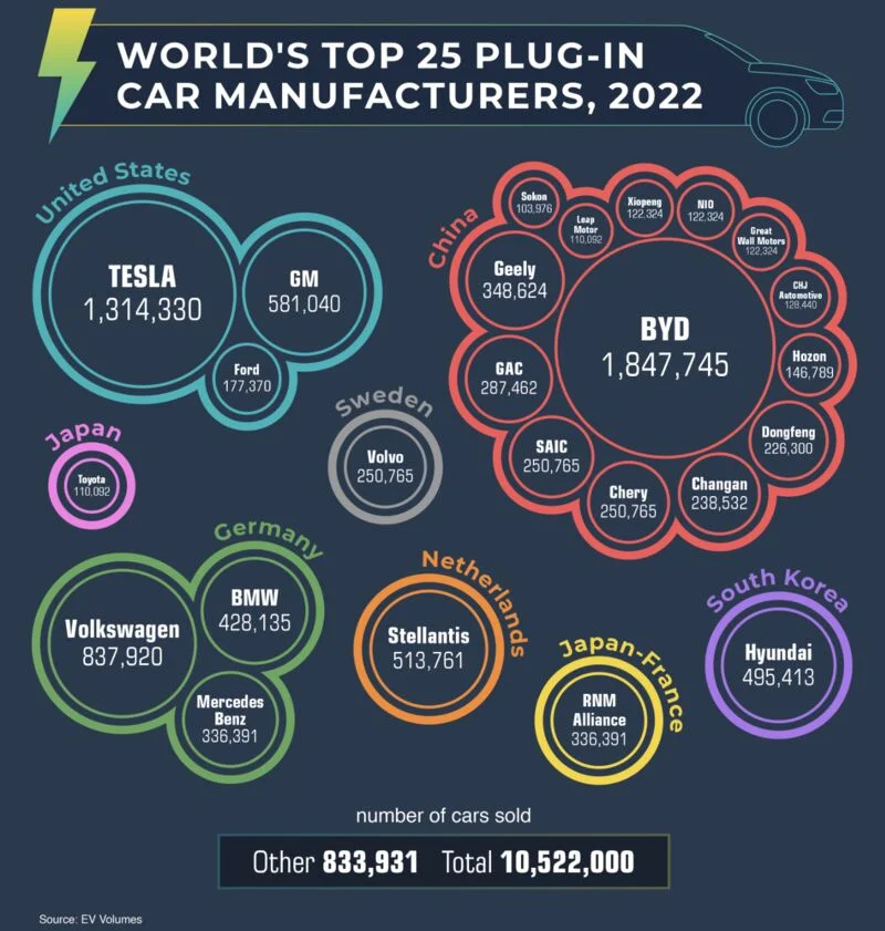 Tesla, BYD i Volkswagen są obecnie trzema największymi producentami samochodów elektrycznych pod względem wielkości produkcji. Szczególnie Tesla, której produkcja pojazdów elektrycznych wzrosła z kilku tysięcy w 2011 r. do ponad 500 000 w 2020 r., odnotowała znaczny wzrost w ciągu ostatnich dziesięciu lat. Tesla ubiegły rok zamknęła wynikiem przekraczającym 1, 3 mln sprzedanych aut elektrycznych (BEV).