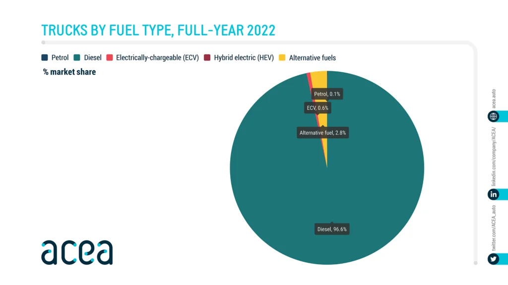 Pomimo wzrostu w ubiegłym roku, pojazdy ładowane elektrycznie nadal stanowiły zaledwie 0,6% rynku samochodów ciężarowych w UE. Pojazdy z napędem alternatywnym stanowiły 2,8% wszystkich ciężarówek sprzedanych w UE. Jak wynika z raportu przedstawionego przez ACEA (Europejskie Stowarzyszenie Producentów Pojazdów) w 2022 r. ciężarówki z silnikiem wysokoprężnym pozostały dominującym wyborem dla nabywców w Unii Europejskiej, stanowiąc 96,6% wszystkich nowych rejestracji.