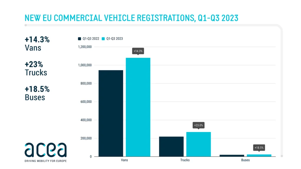 Jak wynika z wyliczeń ACEA (Europejskie Stowarzyszenie Producentów Pojazdów) w pierwszych trzech kwartałach 2023 r. sprzedaż nowych samochodów dostawczych w UE wzrosła o 14,3% do 1 miliona sztuk. Do tego pozytywnego wyniku przyczyniły się przede wszystkim dobre wyniki na głównych rynkach UE, przy czym dwucyfrowy wzrost odnotowały Hiszpania (+20,5%), Niemcy (+18,2%) i Włochy (+16,7%).