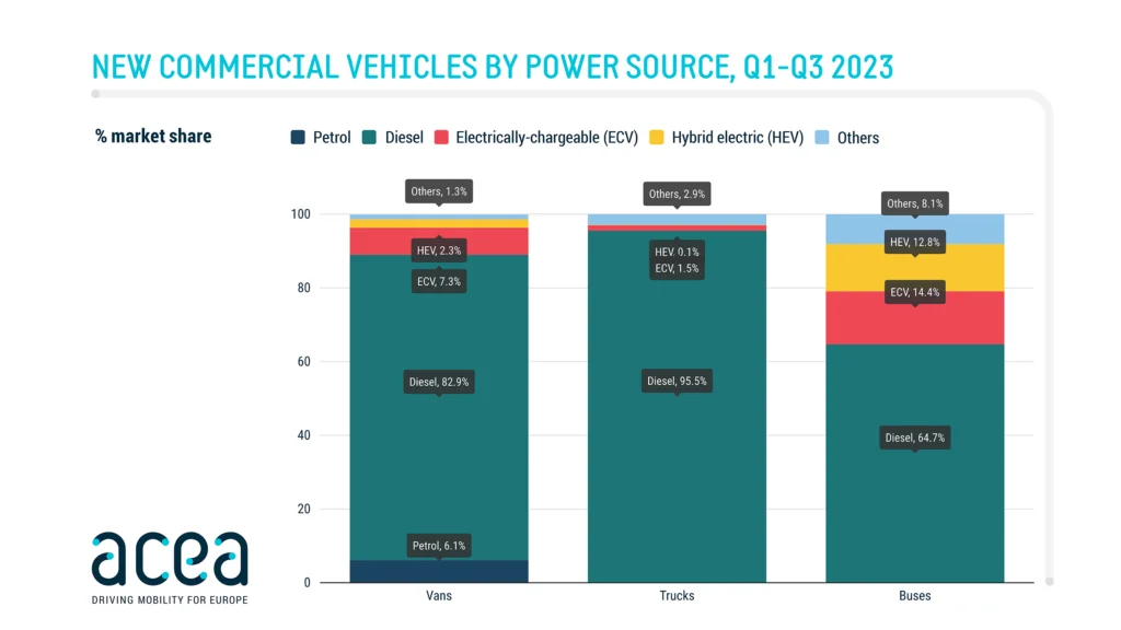 Na rynku samochodów ciężarowych nadal dominował olej napędowy, stanowiący 95,5% rejestracji tych aut od stycznia do września tego roku. Sprzedaż ciężarówek z silnikiem diesla w UE wzrosła o 22%, do czego przyczynił się wzrost na głównych rynkach: w Niemczech (+29,7%), Francji (+14%), Polsce (+11,9%) i Włoszech (+17,9%). Liczba rejestracji nowych elektrycznych ciężarówek wzrosła o imponujące 321,7%, osiągając łączną liczbę 3918 sztuk. Głównymi motorami tego wzrostu były Niemcy (+297,9%) i Holandia (+1463,6%), które odpowiadały za 65% sprzedaży elektrycznych ciężarówek w UE. Elektryczne ciężarówki stanowią obecnie 1,5% rynku, co jednak stanowi znaczny postęp w porównaniu z 0,4% w roku poprzednim.