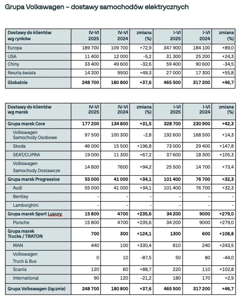 Dostawy aut EV spadły tylko w Chinach. Na innych rynkach znacznie wzrosły, co widać w tabeli. Najwięcej zyskały elektryczne Porsche, a także Skody i Seaty/Cupry. To zasługa premier – takich jak Macan, Elroq czy Tavascan. W planach grupa VAG ma kolejne prezentacje, takie jak VW ID.2 czy elektryczne Porsche 718. Liczby zapewne będą się dalej zwiększać. Hołd dla tradycji – taki jak w opisywanym ID.3 – to także miły gest, podkreślający związki obecnych Volkswagenów z tymi sprzed lat.