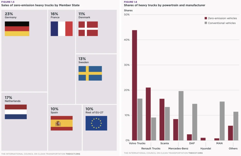 Niemcy i Francja są obecnie liderami w tej transformacji, przyczyniając się do ponad połowy sprzedaży pojazdów ciężarowych w UE-27. Ten wzrost sprzedaży jest bardziej wyraźny także w mniejszych państwach członkowskich, takich jak Dania, Szwecja i Niderlandy.