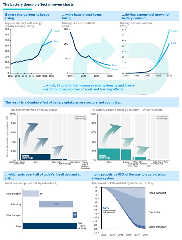 Technologia baterii ma potencjał przejęcia całego transportu drogowego, umożliwić odnawialnym źródłom energii wyparcie energii elektrycznej wytwarzanej z paliw kopalnych oraz odegrać bezpośrednią lub wspomagającą rolę w dekarbonizacji lotnictwa i żeglugi. Oznacza to, że baterie mogą zagrozić ponad połowie globalnego zapotrzebowania na paliwa kopalne: 18% z transportu drogowego, 35% z energii elektrycznej i kolejne 4% z innych rodzajów transportu.