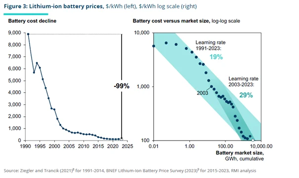 Spadek kosztów baterii był równie imponujący. Od 1991 roku ceny spadły o 19% przy każdym podwojeniu produkcji. To nie tylko poprawiło ekonomikę istniejących zastosowań, ale także umożliwiło wejście na rynek nowym sektorom.