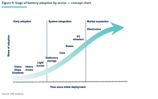 Efekt domina obejmuje również sektory. Baterie, stosowane początkowo w elektronice użytkowej, motocyklach i autobusach, wkroczyły do samochodów, a teraz obejmują magazynowanie energii i transport ciężarowy. Ocenia się, że do 2030 r. znajdą zastosowanie w statkach i samolotach krótkodystansowych.
