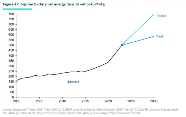 Inne, oddolne oceny ekspertów dotyczące przyszłej gęstości energii akumulatorów wydają się potwierdzać wykonalność tej prognozy. Już dziś istnieją laboratoryjne ogniwa akumulatorowe o gęstości energii przekraczającej 700 Wh/kg. Technologie te są na dobrej drodze do komercjalizacji. Argonne National Labs podaje nawet potencjał na poziomie 1200 Wh/kg, jeśli pewne przełomowe odkrycia zostaną dokonane wcześniej niż oczekiwano. Akumulatory te wciąż mają przed sobą długą drogę by trafić na rynek, ale wyniki badań laboratoryjnych pokazują, że istnieją wystarczające powody, by sądzić, że gęstość ogniw może wzrosnąć znacznie powyżej 600 i osiągnąć 800 Wh/kg do 2030 roku.
