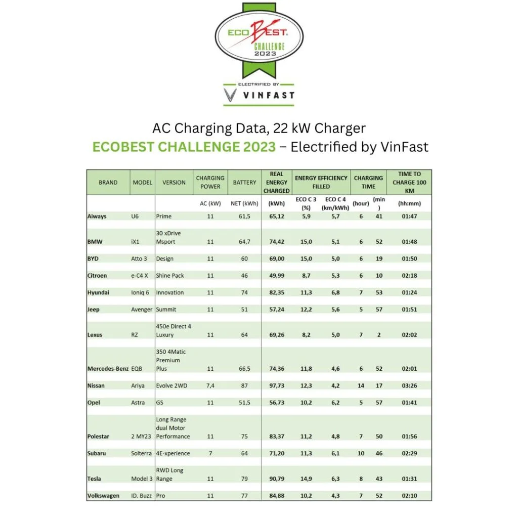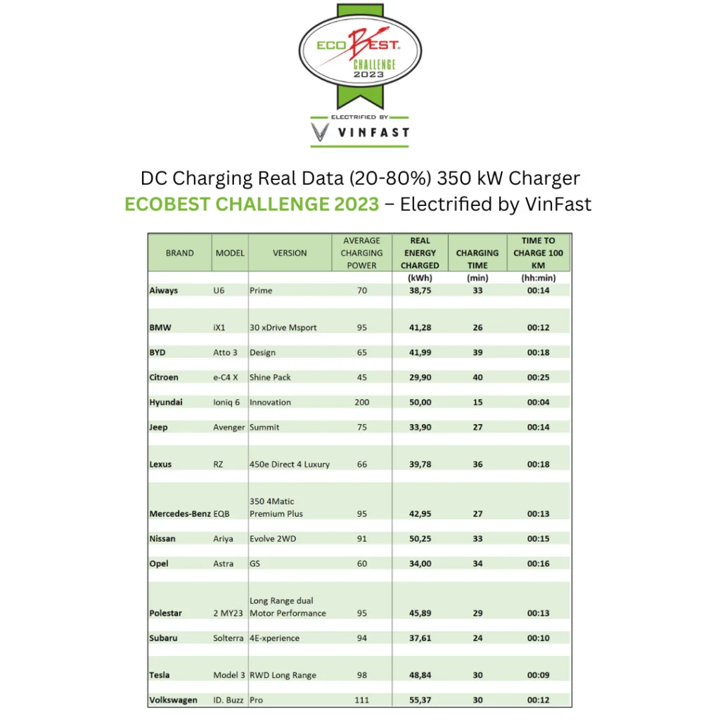 Jak się okazuje żaden z 14 testowanych modeli nie przekroczył homologowanego zakresu w cyklu WLTP. Jednak 6 z 14 popularnych samochodów elektrycznych osiągnęło ponad 90% homologowanego zakresu WLTP w rzeczywistych warunkach jazdy. A tylko 3 osiągnęły mniej niż 80% zakresu WLTP. To lepszy wynik w porównaniu z ubiegłoroczną edycją EcoC. W tej edycji padł też rekord wszech czasów dla szybkiego ładowania prądem stałym w zaledwie 4 minuty do zasięgu 100 km! Zdaniem organizatorów ten wynik jest dowodem na to, że już wkrótce nie będzie różnicy czasowej między ładowaniem akumulatora a napełnieniem zbiornika!