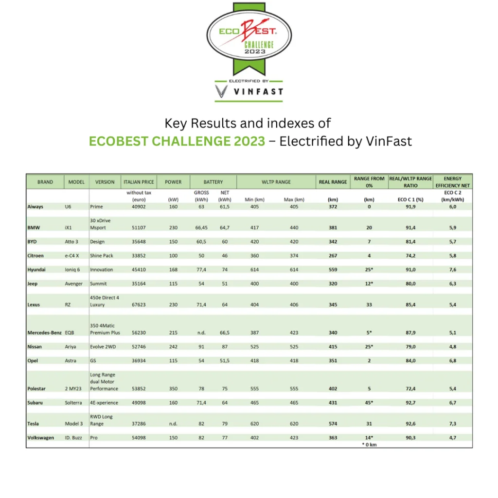 W tegorocznej edycji testowane modele to: Aiways U6, BMW iX1, BYD Atto 3, Citroen e-C4 X, Hyundai Ioniq 6, Jeep Avenger, Lexus RZ, Mercedes-Benz EQB, Nissan Ariya, Opel Astra, Polestar 2 MY23, Subaru Solterra, Tesla Model 3 i Volkswagen ID. Przetestowano elektryki z homologowanym zasięgiem przekraczającym 350 km oraz w cenie nie przekraczającej 70 000 euro (bez podatków). Co istotne wszystkie samochody pochodziły z regularnej produkcji i podczas testu w aucie przebywał tylko kierowca, który podróżował w trybie jazdy „Normal” i przestrzegał ograniczeń prędkości. Wszystkie poruszały się po tej samej trasie, w tym samym czasie i takich samych warunkach atmosferycznych. Podczas testu temperatura powietrza we Włoszech wahała się od 26 do 33 stopni.