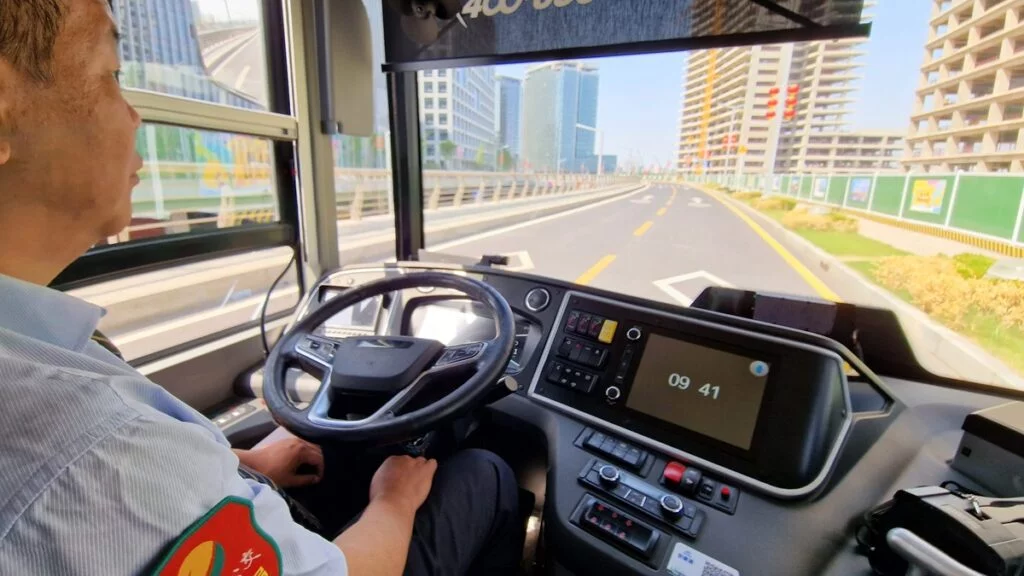 Autobusy autonomiczne Yutong działają na 4 poziomie autonomii, co oznacza, że teoretycznie mogą wykonywać wszystkie funkcje jazdy bez ingerencji człowieka w określonych warunkach, takich jak wyznaczone trasy. Jednak w praktyce regulacje zarówno w Chinach, jak i innych państwach na świecie ściśle ograniczają jazdę bez kierowcy. Będąc w Zhengzhou, Yutong zabrał nas na testowy przejazd swoim autobusem w trybie autonomicznym. Trasa przebiegała przez miasto, ale była z góry określona, na której to Yutong miał pozwolenie do testów jazdy autonomicznej. Podczas przejazdu, za kierownicą musiał być obecny kierowca w razie, gdyby jednak technologia zawiodła. Należy pamiętać, że jest ona w fazie testów i cały czas się rozwija. Jednak niemalże przez całą trasę autobus przejechał bez ingerencji człowieka (z drobnymi korektami), co było unikalnym doświadczeniem.