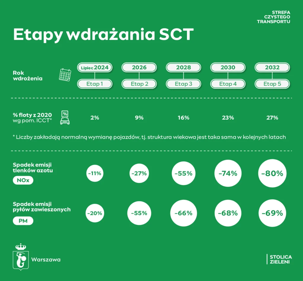 Proces wprowadzania STC w Warszawie zaplanowano na kilka etapów, które będą wprowadzane sukcesywnie, począwszy od lipca 2024 roku. Pierwszy etap zakłada objęcie ograniczeniami 2% floty pojazdów z 2020 roku, co powinno przynieść spadek emisji tlenków azotu (NOx) o 11% oraz pyłów zawieszonych (PM) o 20%.