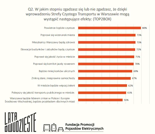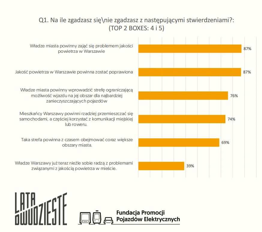 Zdecydowana większość mieszkańców stolicy zdaje sobie sprawię, że problemu zanieczyszczenia powietrza nie da się rozwiązać bez aktywnych działań władz. 76% osób stwierdziło, że jednym z nich powinno być powstanie w Warszawie strefy czystego transportu.