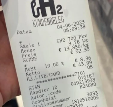 Nasz rozmówca, użytkownik Toyoty Mirai, przekazał nam, że zużycie wodoru to “czasami mniej, czasami więcej w zależności od warunków i stylu jazdy, ale można przyjąć, że to około 1 kg/100 km”. Pokazał nam paragon z jednego z ostatnich tankowań z podróży do Berlina. Cena 1 kg wodoru to 13,85 EUR, więc koszt pokonania 100 km to około 62 zł brutto (kurs EUR/PLN 4,43).