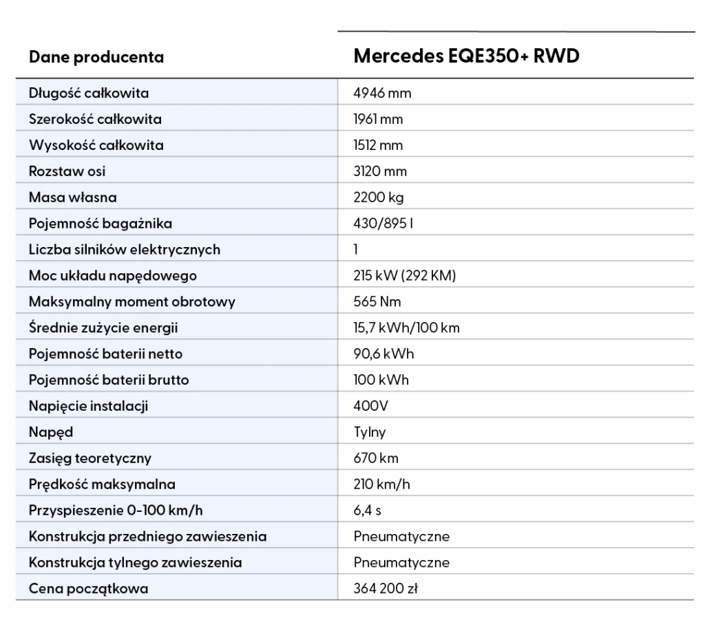 Jeżeli natomiast chodzi o sam samochód to jest to limuzyna z krwi, portfela i kości. Jego posiadanie to frajda, a zasięg mimo trudnych warunków wystarczający, by długą trasę po Polsce odbyć z przerwą na odpoczynek i kawę. EQE to jeden z lepszych elektrycznych Mercedesów. Przede wszystkim w odróżnieniu od EQS, który miałem okazję testować wcześniej i który charakteryzował się o wiele większym zużyciem energii. W tym przypadku były to rozsądne wyniki biorąc pod uwagę masę samochodu (2200 kg) oraz gabaryty (długość 4946 mm, szerokość 1961 mm, wysokość 1512 mm, rozstaw osi 3120 mm, prześwit 125 mm).